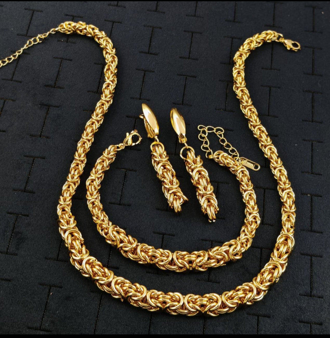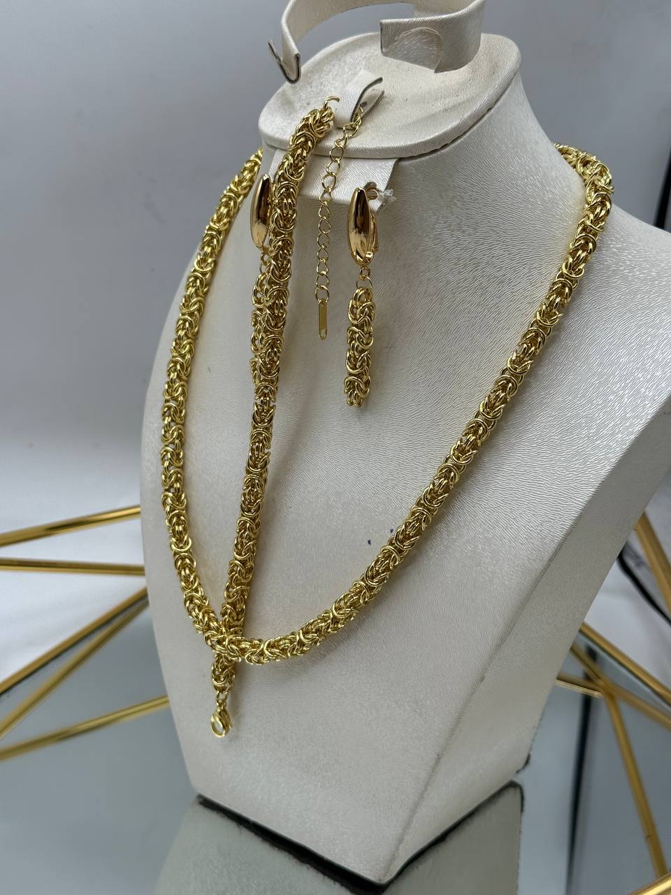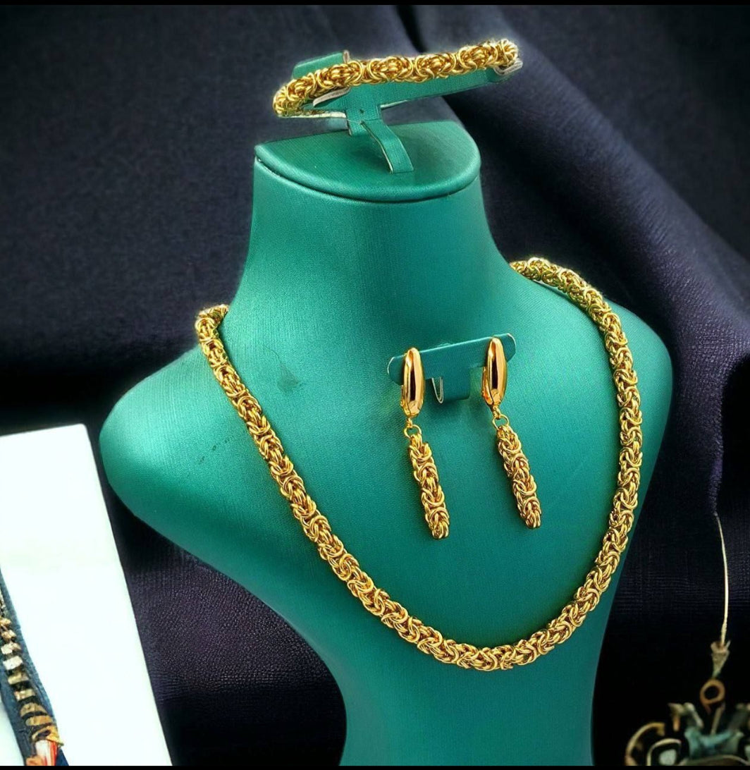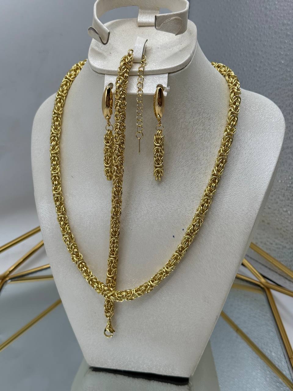 Composée d’un collier, d’un bracelet et de boucles d’oreilles assorties, elle se distingue par sa maille travaillée façon torsade luxueuse et brillante. Un bijou intemporel qui allie style et durabilité — parfait pour sublimer vos tenues avec raffinement.